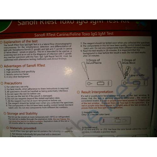 RAPID TEST TOXOPLASMA/Feline Toxoplasma IgG/IgM Antibody Rapid Test Kit is a qualitative immunochromatographic assay for the detection of Toxoplasma gondii antibodies in whole blood, serum or plasma within just 5-10 minutes.