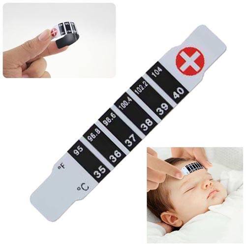 -Tempel atau diletakkan di dahi bayi, termometer akan menunjukkan suhu, Anda dapat membaca suhu dari perubahan warna.